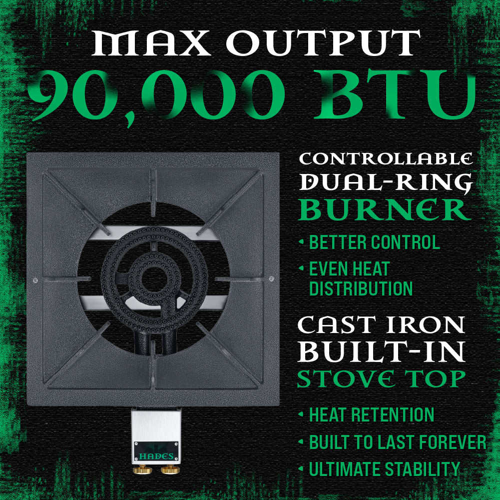 Our burner head features dual controllable burner rings: an inner ring and an outer ring. Totaling 90,000 BTU