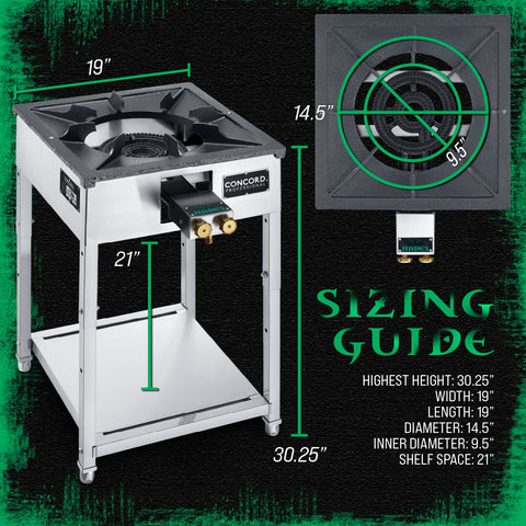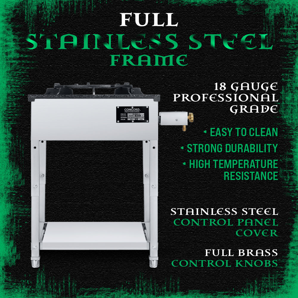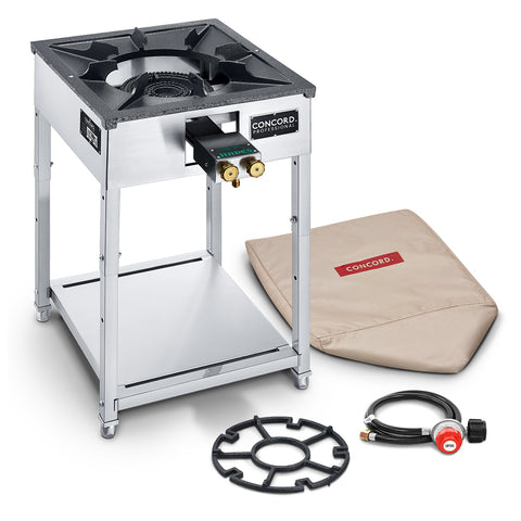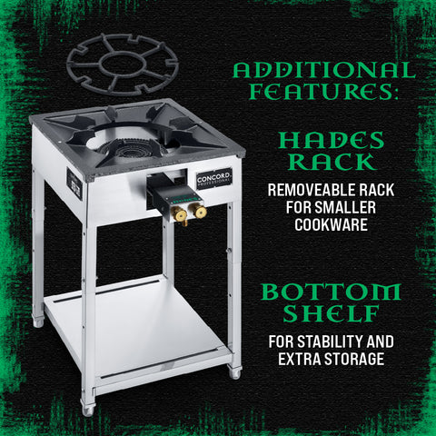 The HADES Stove is Concord's newest line of commercial propane ranges, featuring a full stainless steel frame with a solid cast iron range top and grates.