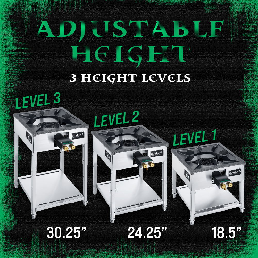 This range is fully height adjustable. Capable of adjusting to 3 different heights. The HADES Stove features a built in shelf for stability and storage space.