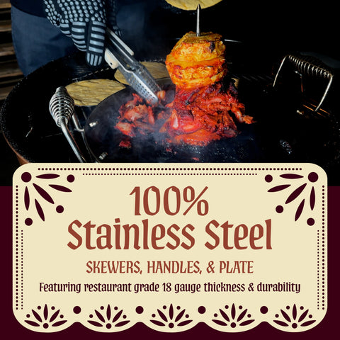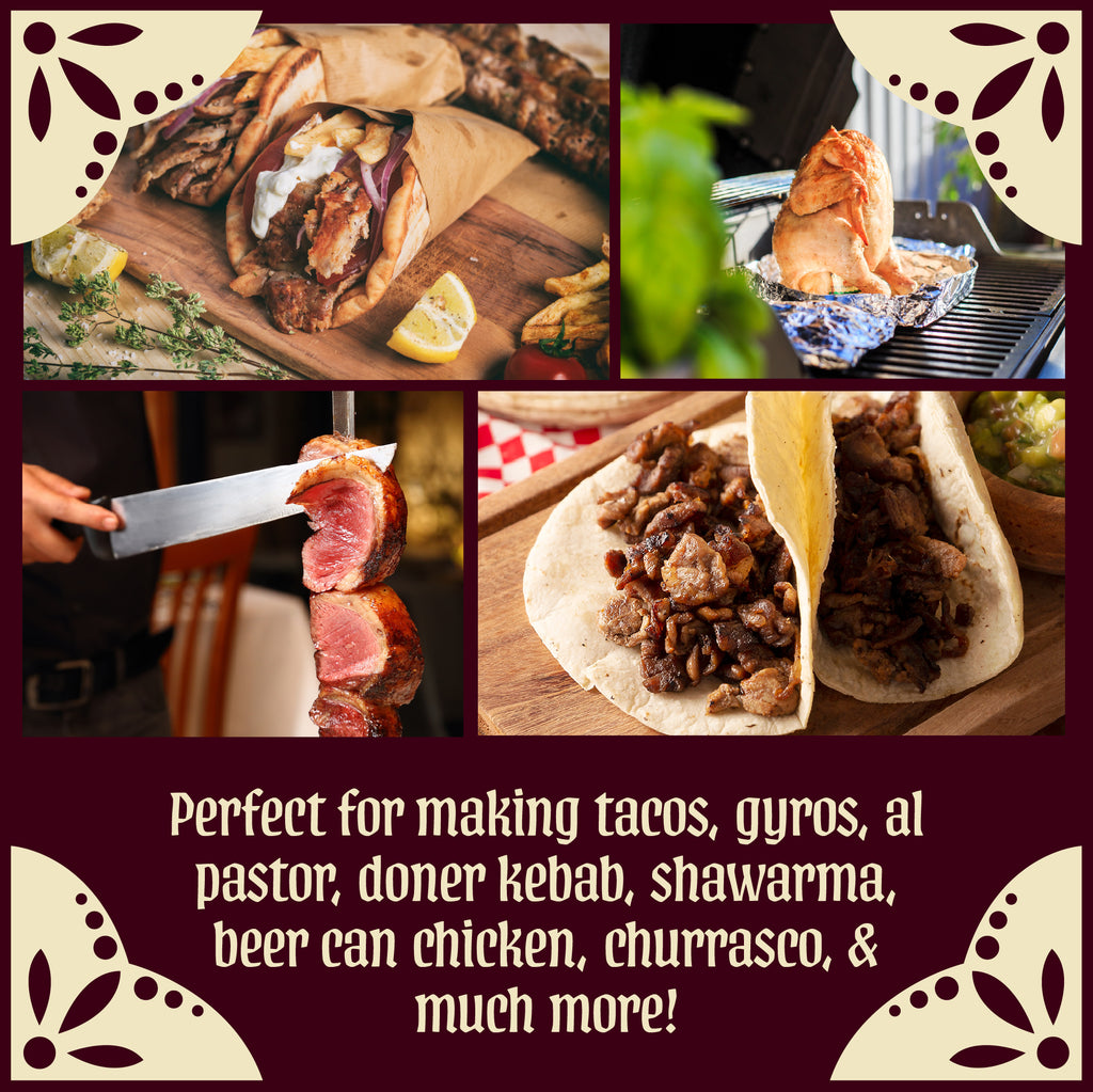 Perfect for making, Tacos Al Pastor, Gyro, Shawarma, and even roasting a whole chicken on your BBQ grill without the need of a trompo para tacos al pastor machine.