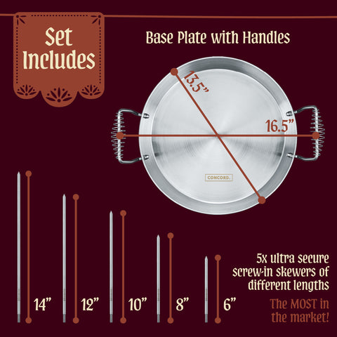 Our vertical rotisserie stand includes 5 ultra secure screw in skewers of different length, allowing you to cook as much or as little meat as you need without sacrificing head space.