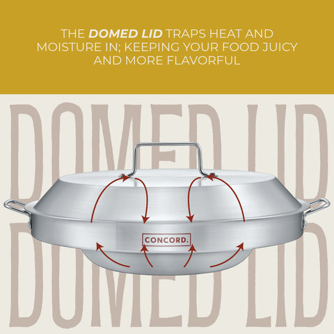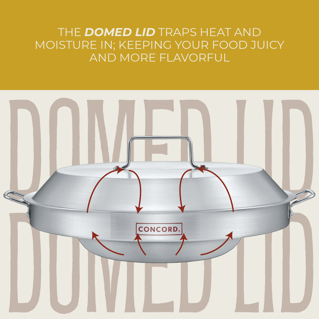 - Domed lid design keeps contents flavorful, juicy, and hot.